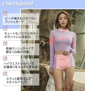 水着 体型カバー レディース フィットネス 長袖 ラッシュガード ショーツ 2点セット 上下 セパレート オトナ女子 可愛い セクシー ハート レースアップ ロゴ ハイウエスト 紫外線対策 ノンワイヤー パッド付き バスト 盛れる 二の腕 お腹 カバーアップ 夏 パープル 2019新作